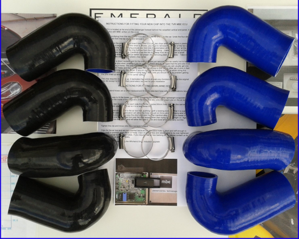 The kit comprises 8 improved fit MK3 short inlet hoses, 16 hose clips, a remapped MBE ECU chip and fitting instructions. Default hose colour is black, blue hoses are also available.